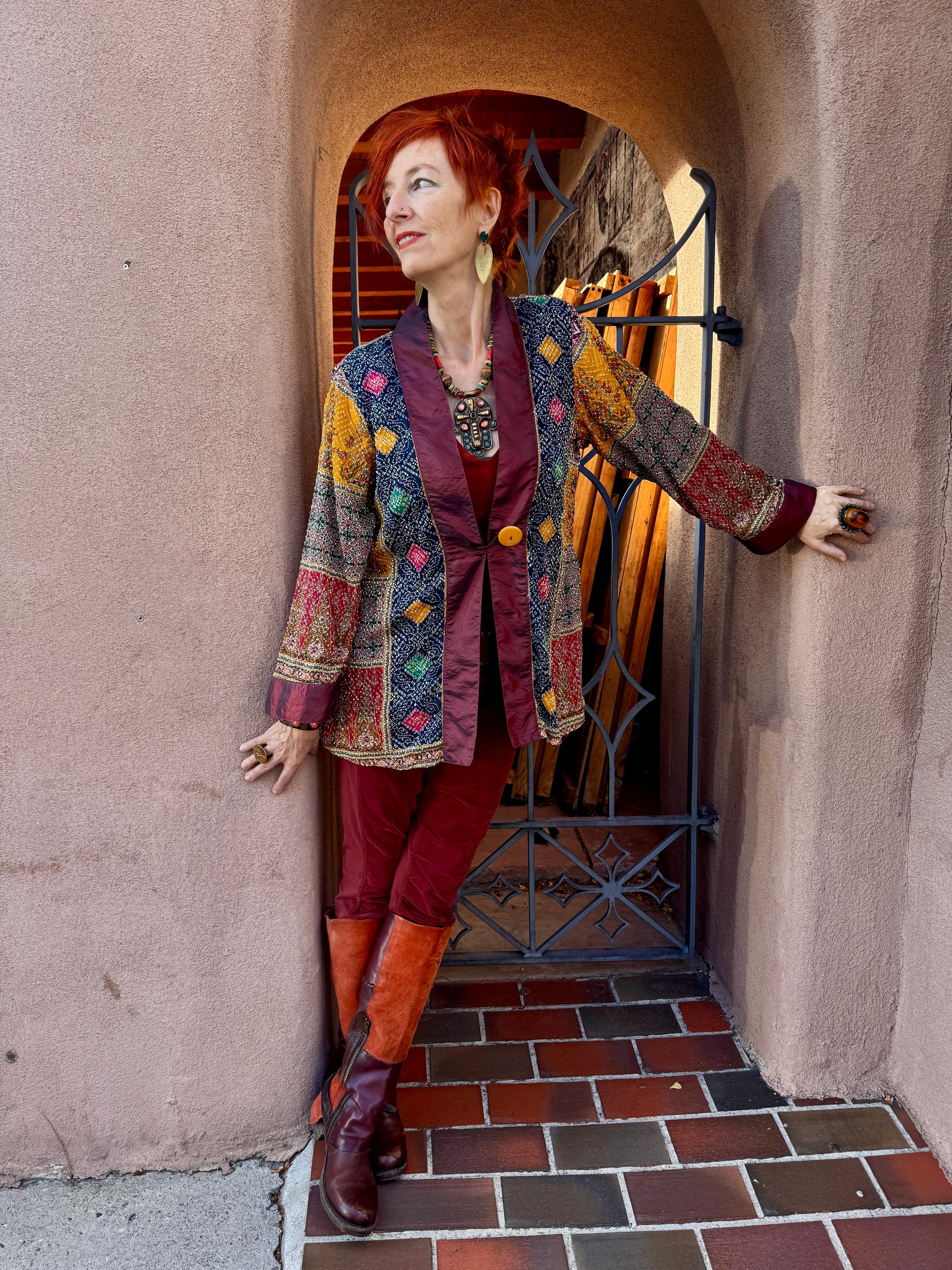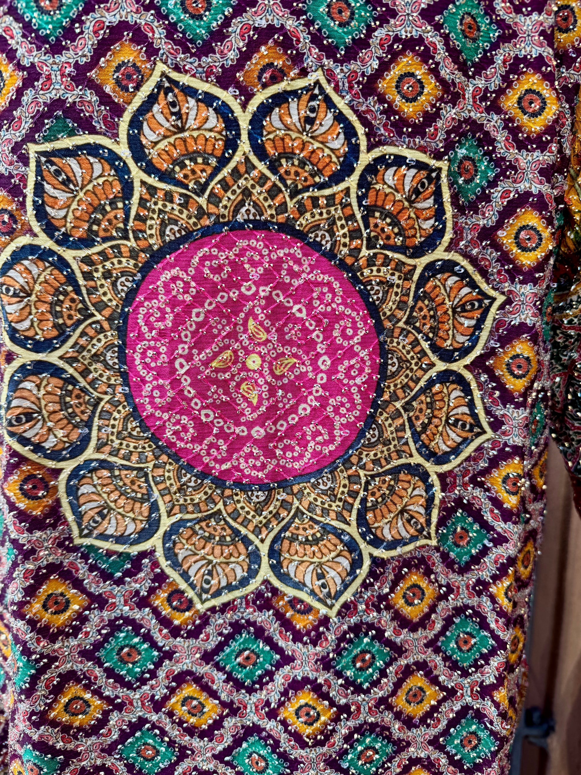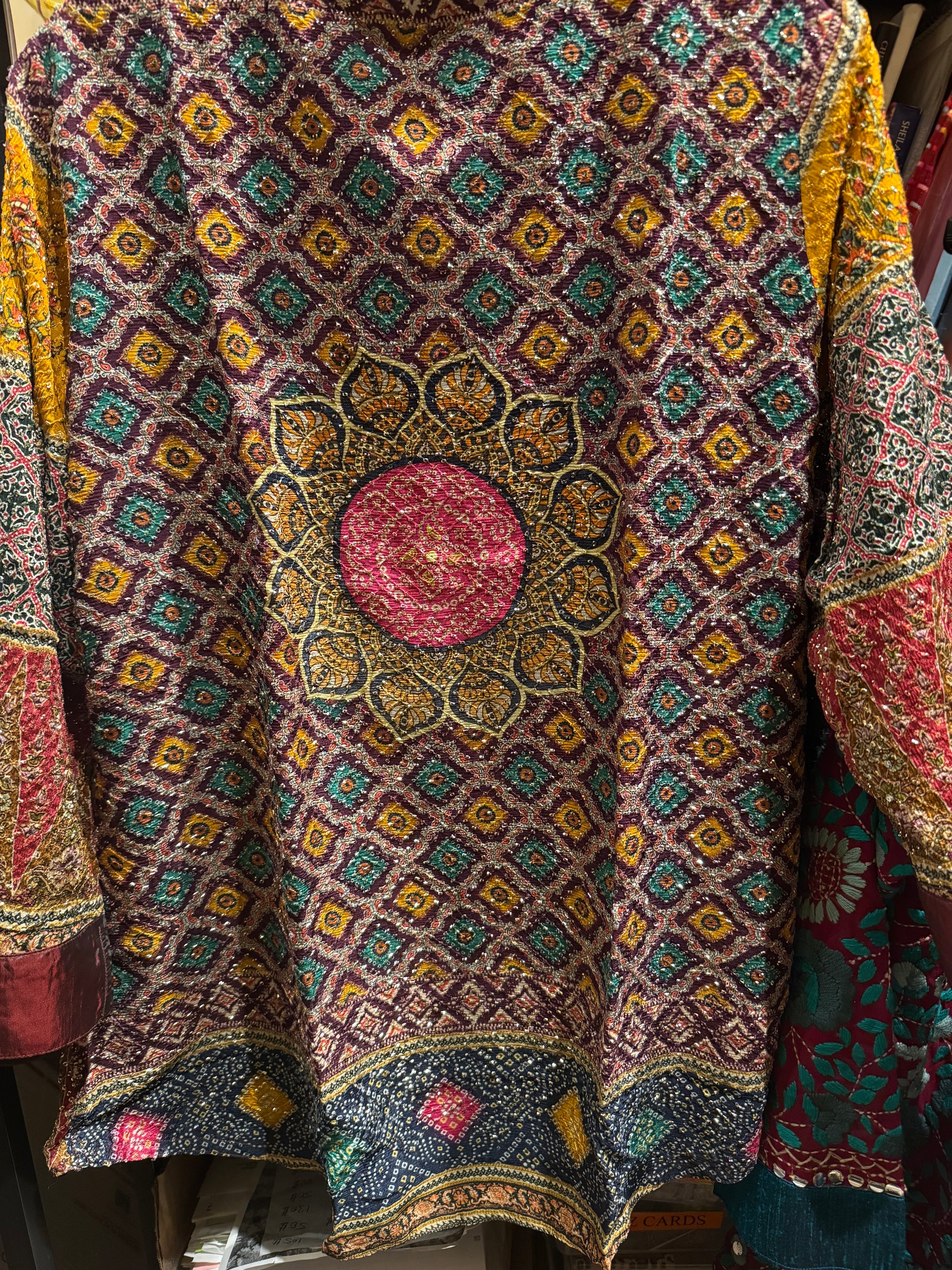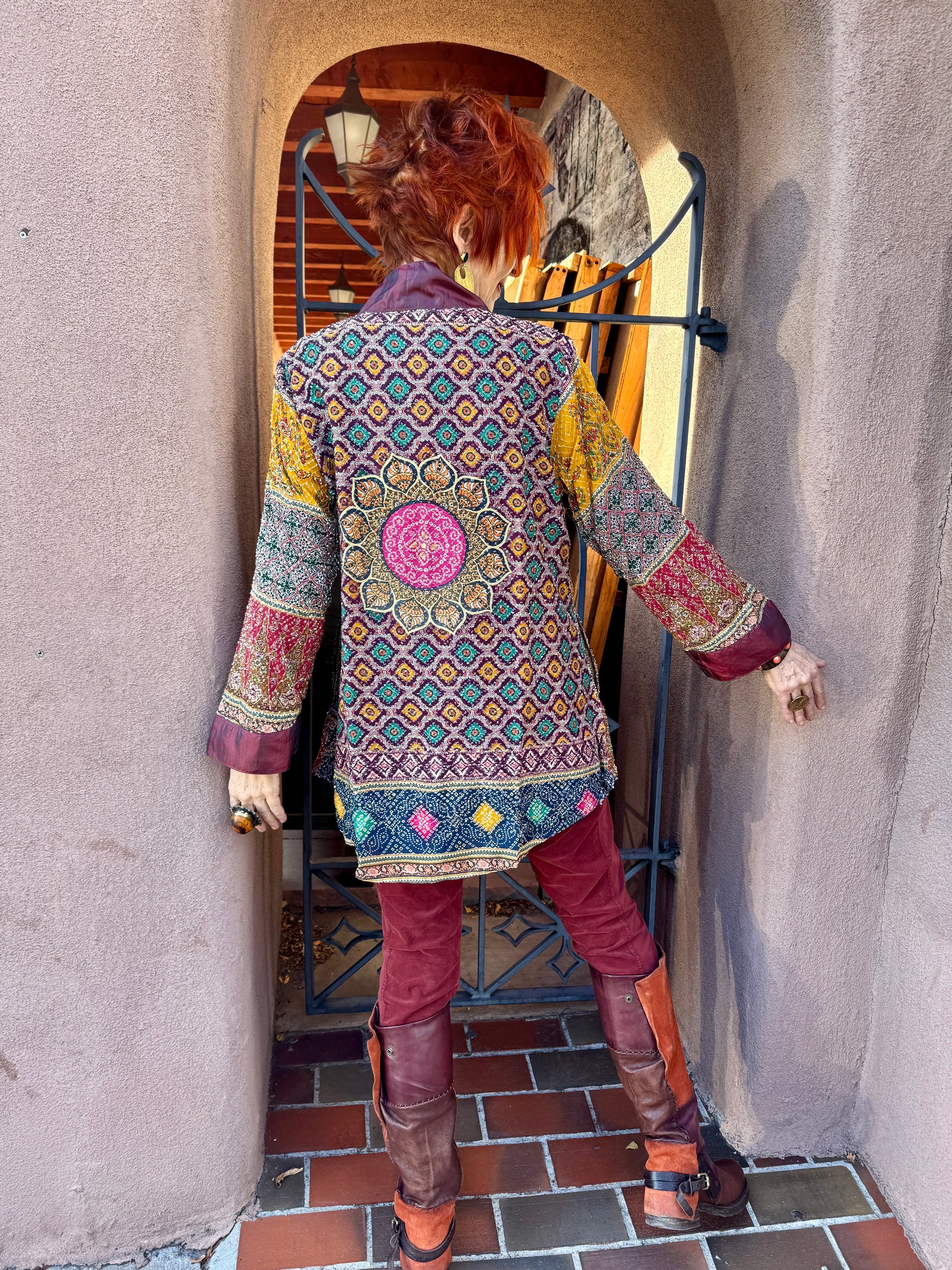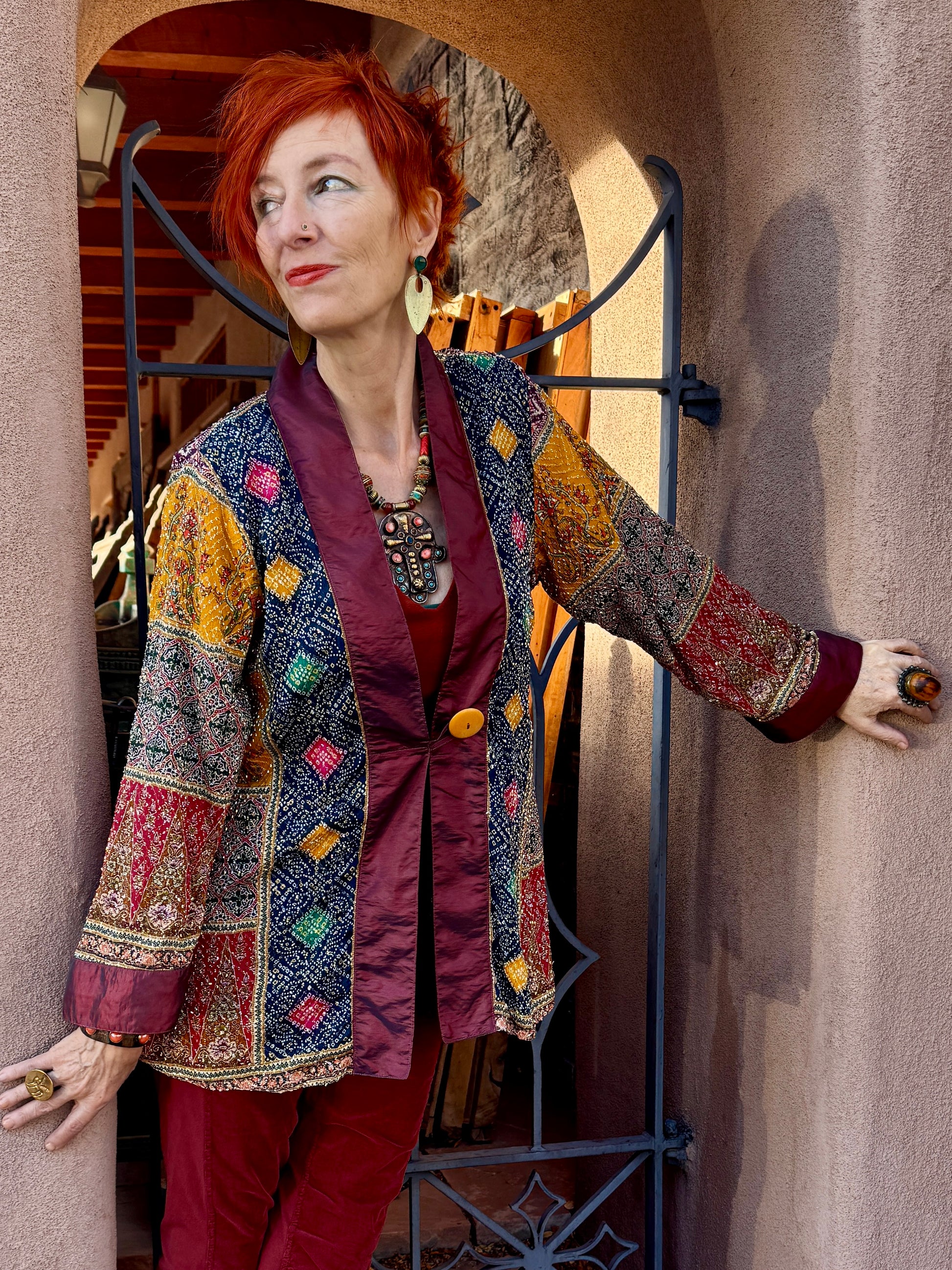Our classic Swing Jacket sings, sparkles, and sizzles for the holidays! Cut from my unusually unique, micro bling synsilk, motifs of Paisley, medallions of Ajrakh, and suggestions of bandhini and ikat all comprise the majestic melange of this stunning jacket. The sequins are all so tiny hence the name: micro bling. Divinely lightweight and lined with georgette, this jacket in size small/medium, 41” chest, tapers at the waist with two side pockets, and one center button closure. OOAK