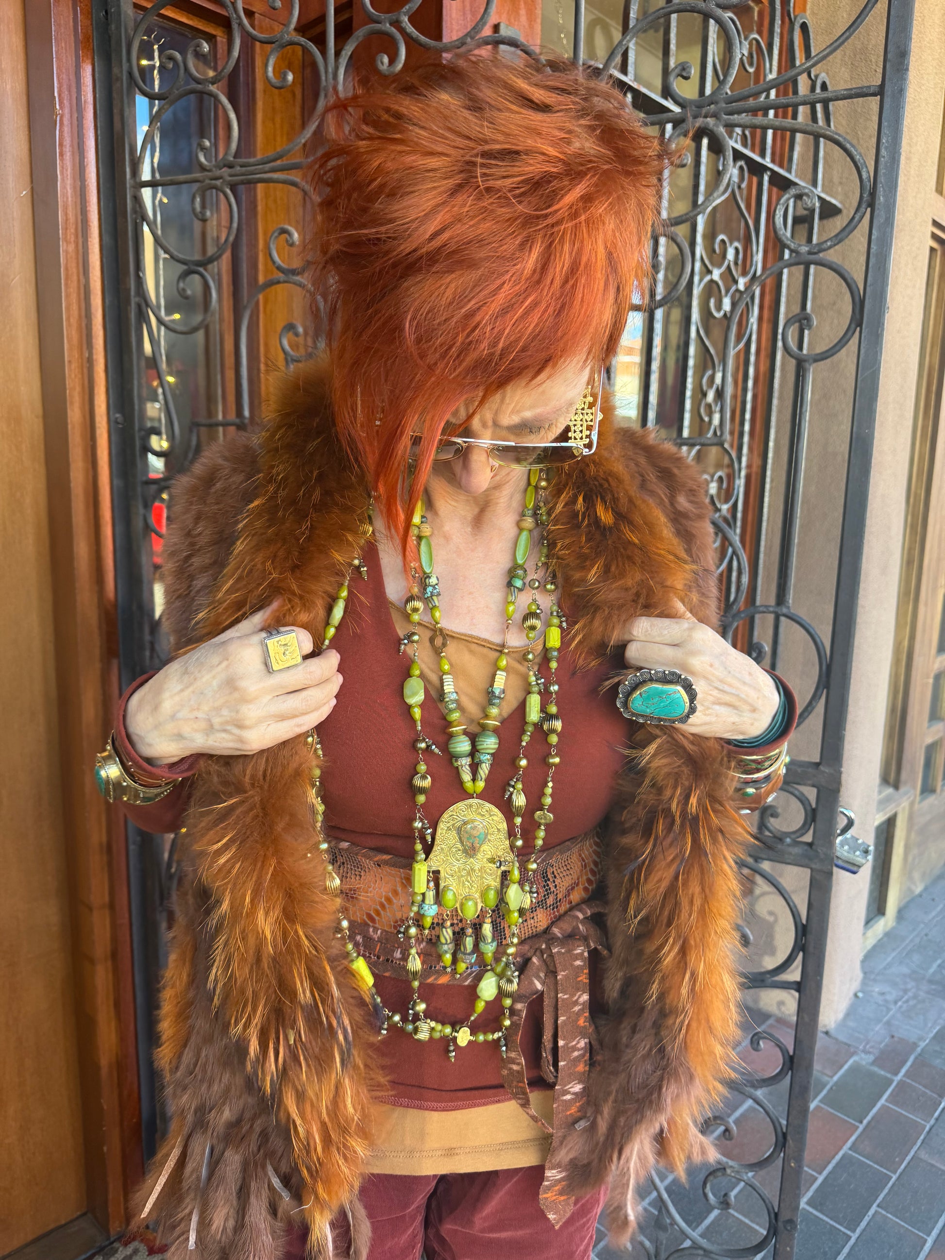 A luxurious line of faceted green serpentine in many shapes: teardrop, round and square. An ultra opera length of 92” long which you can double, triple and quadruple for the perfect look. The gorgeous green serpentine is joined by vintage brass beads, antique gold blister pearls, large faceted lime turquoise cylinders, and lovely layered dangles of pyrite and crystal beads. So many lovely gemstones, beads and hours of loving work. This fabulous piece is wonderful layered with another piece or layered upon itself. Andrea is shown with it doubled. This dreamy swath looks amazing paired with our Golden Hamsa and Earthly Delights necklace linked below.