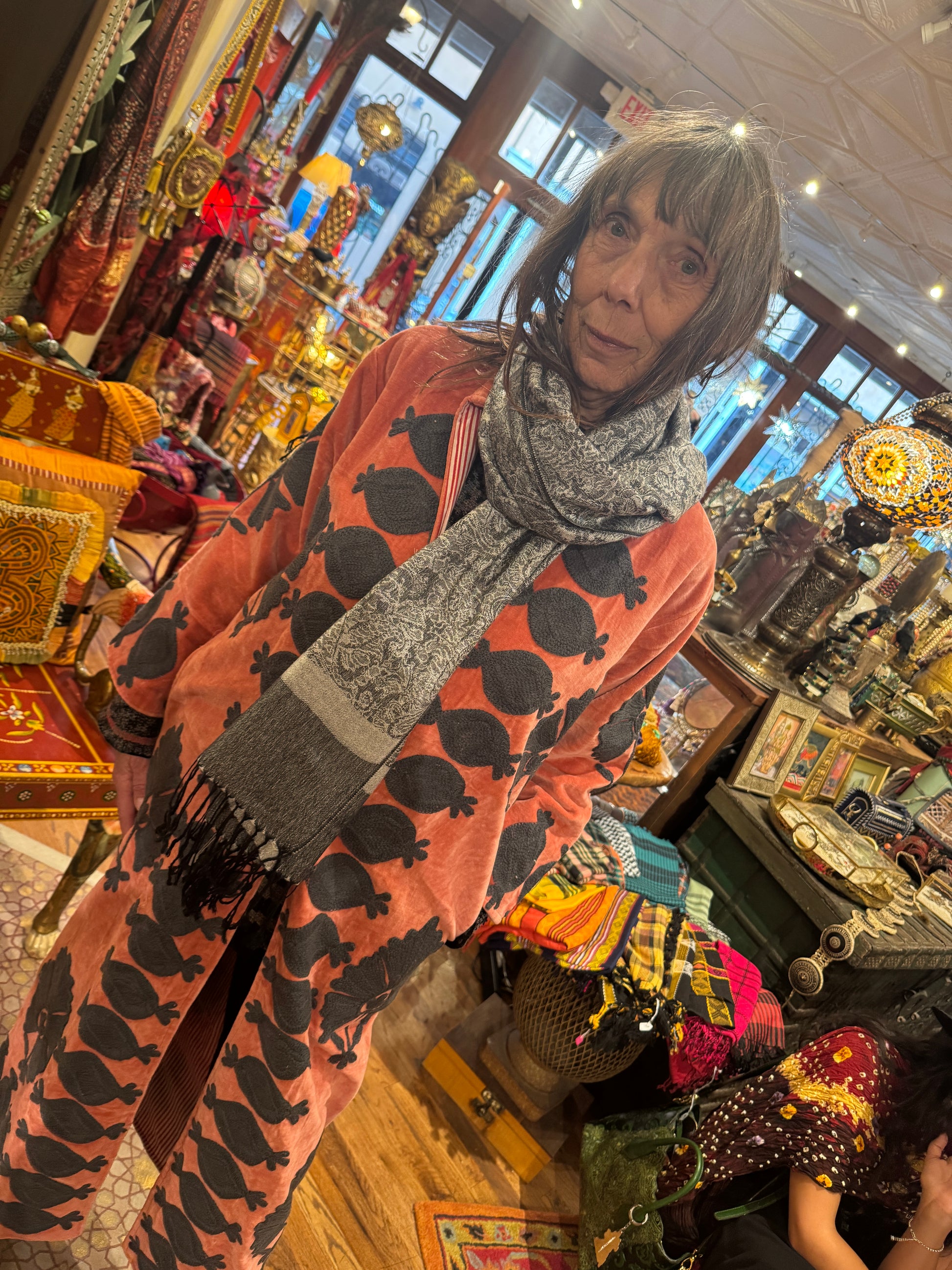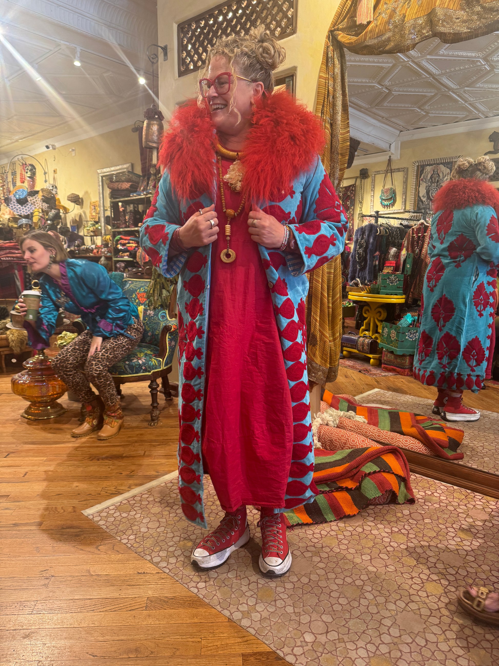Our Luxurious long cotton velvet coat is bold and sophisticated. Large motifs of abstract hand embroidered pomegranates trim the coats opening, hem and cuffs. Fully lined in 100% cotton. 2 side pockets, single button closure. Choose from 5 color variants.