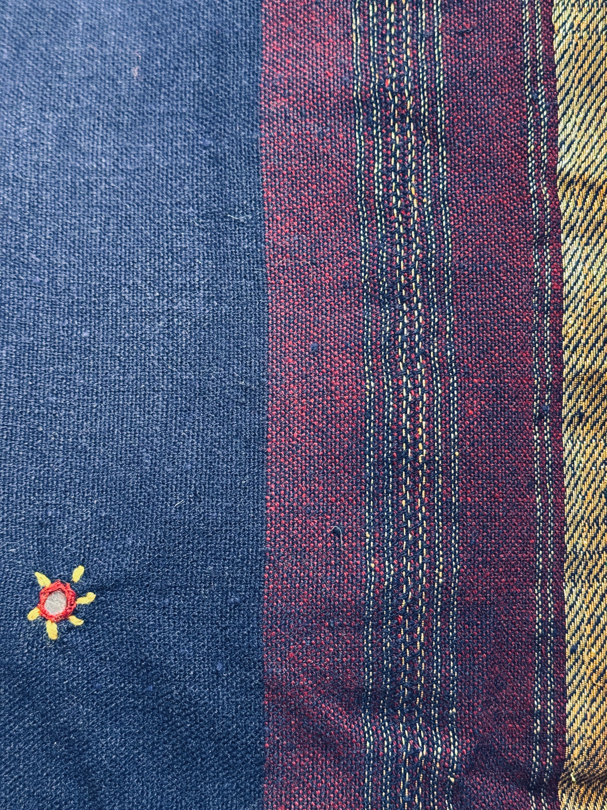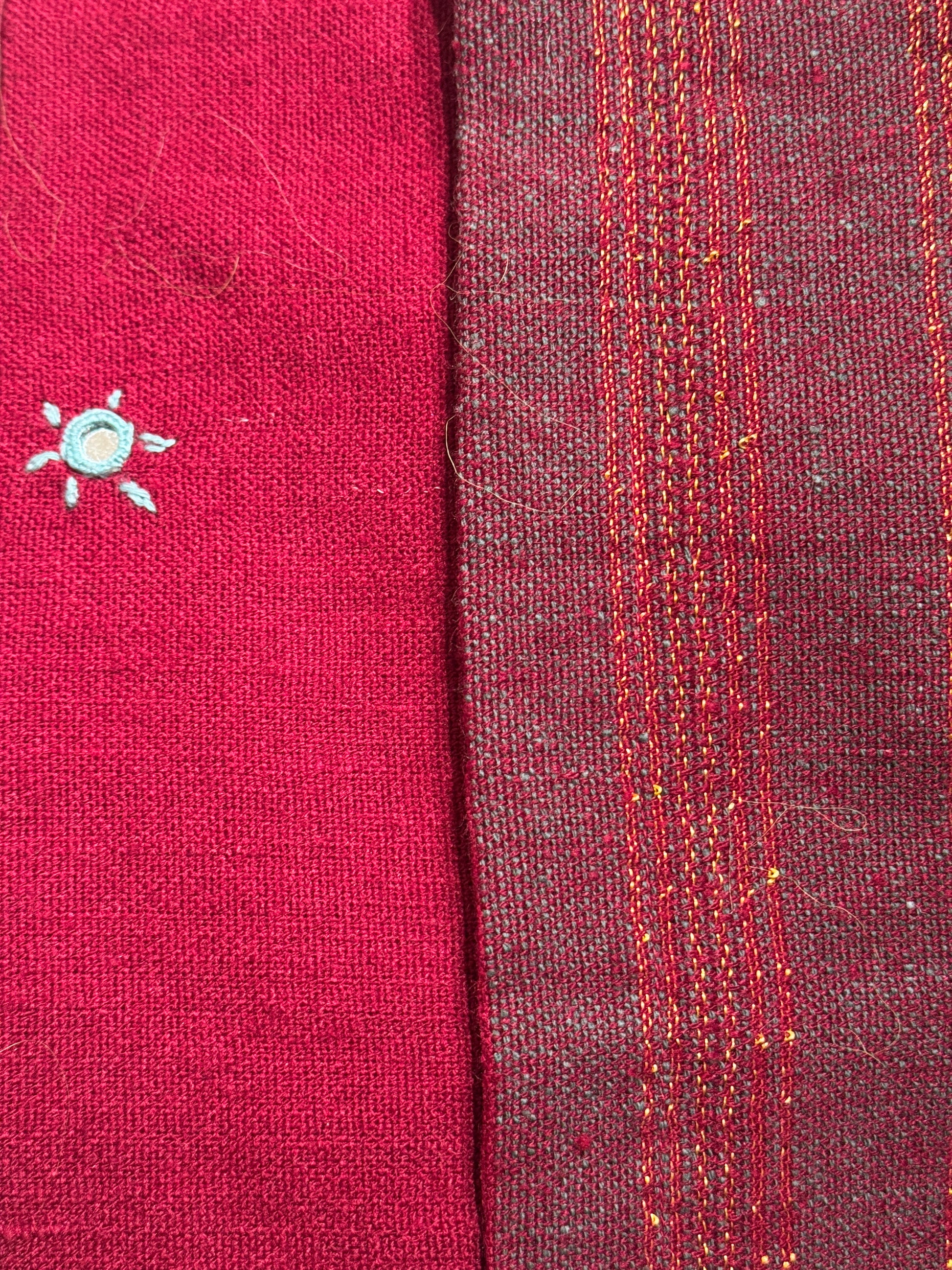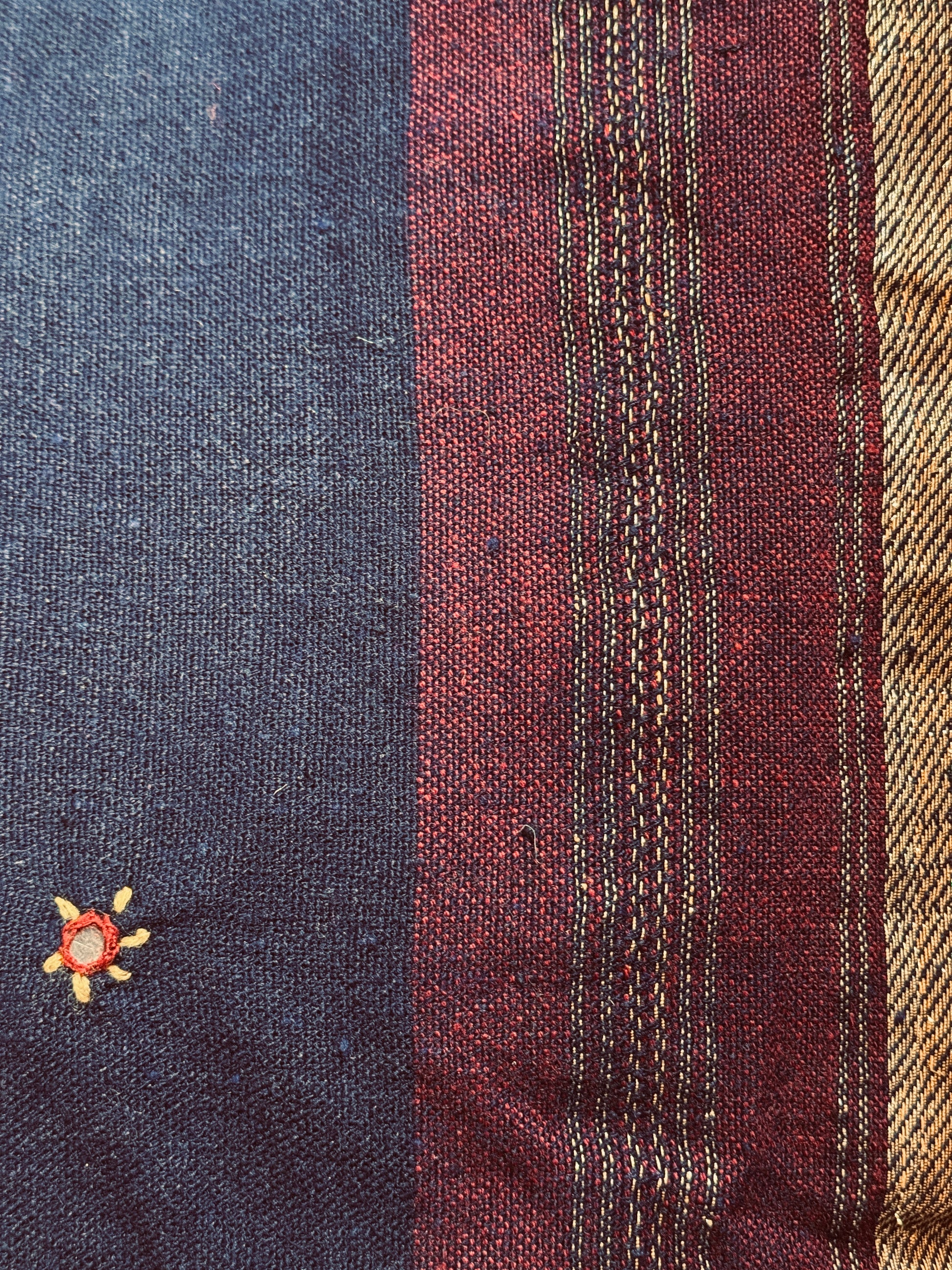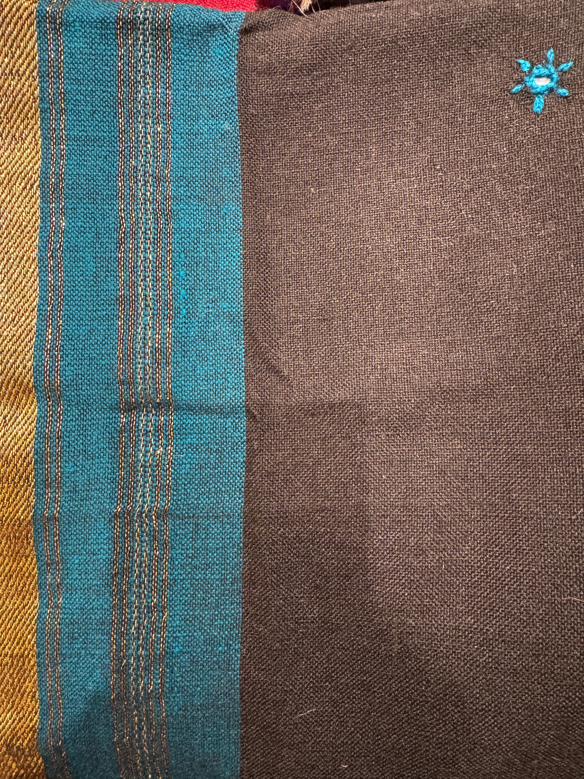 Who doesn’t want to be wrapped up in yummy softness and warmth this cool winter season? That’s exactly what this woolly wrap skirt does— all that and in great style and ease. This wrap skirt is made of hand loomed soft Indian "cotton-wool" which is actually a non itchy synthetic fiber blend. It is soft to the touch. The skirt is enhanced by hand-embroidered mirror work and a striking swath of metallic weave on the vertical. Choose your color story below with sizes Small/Medium and Medium/Large. Norma is wearing a Med/ Large in photos.