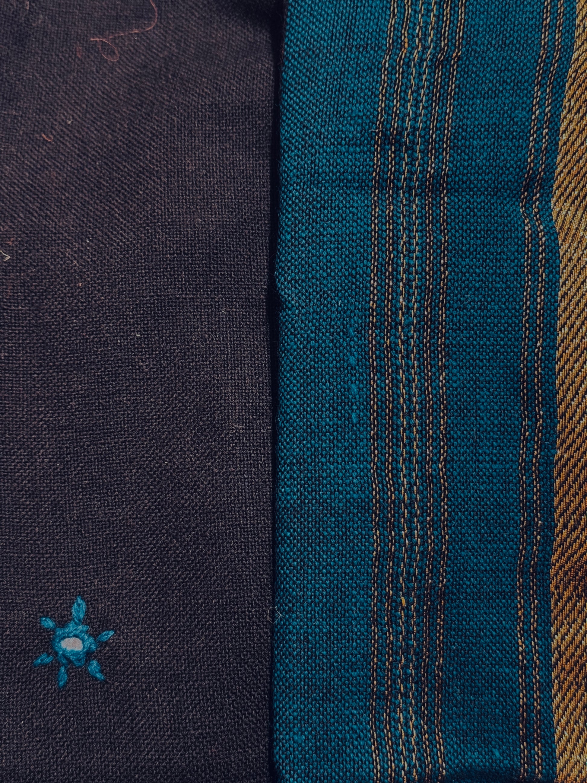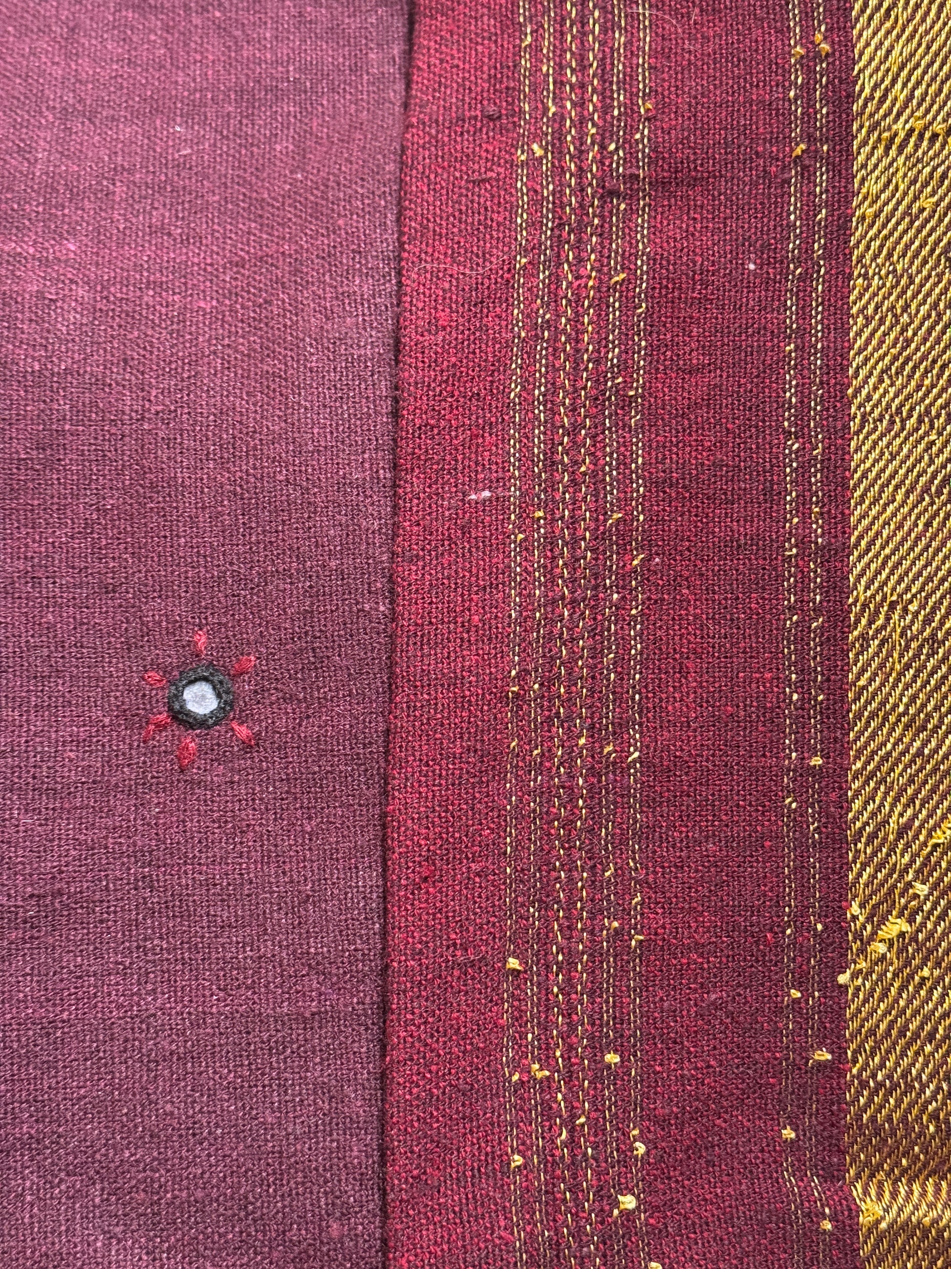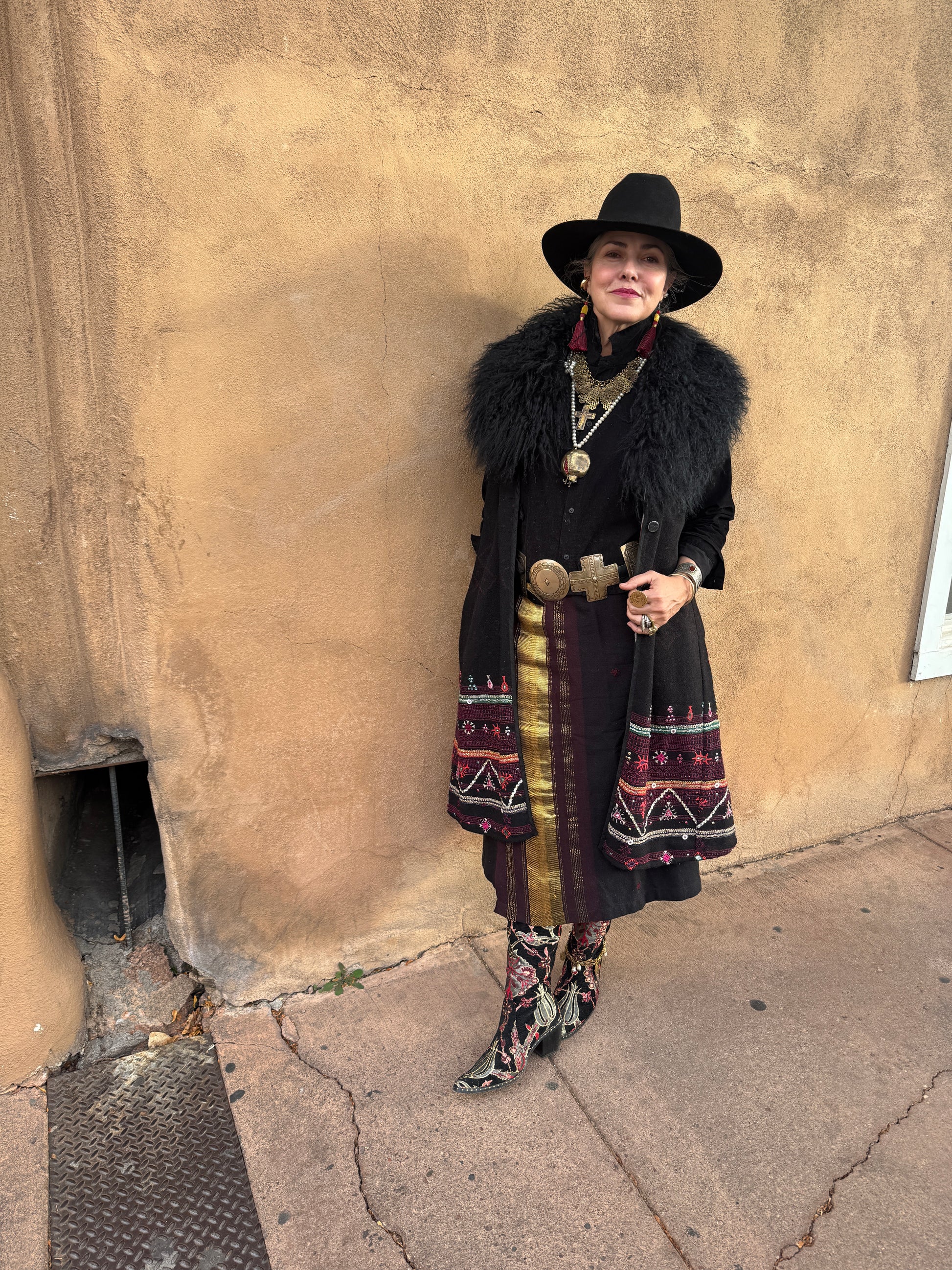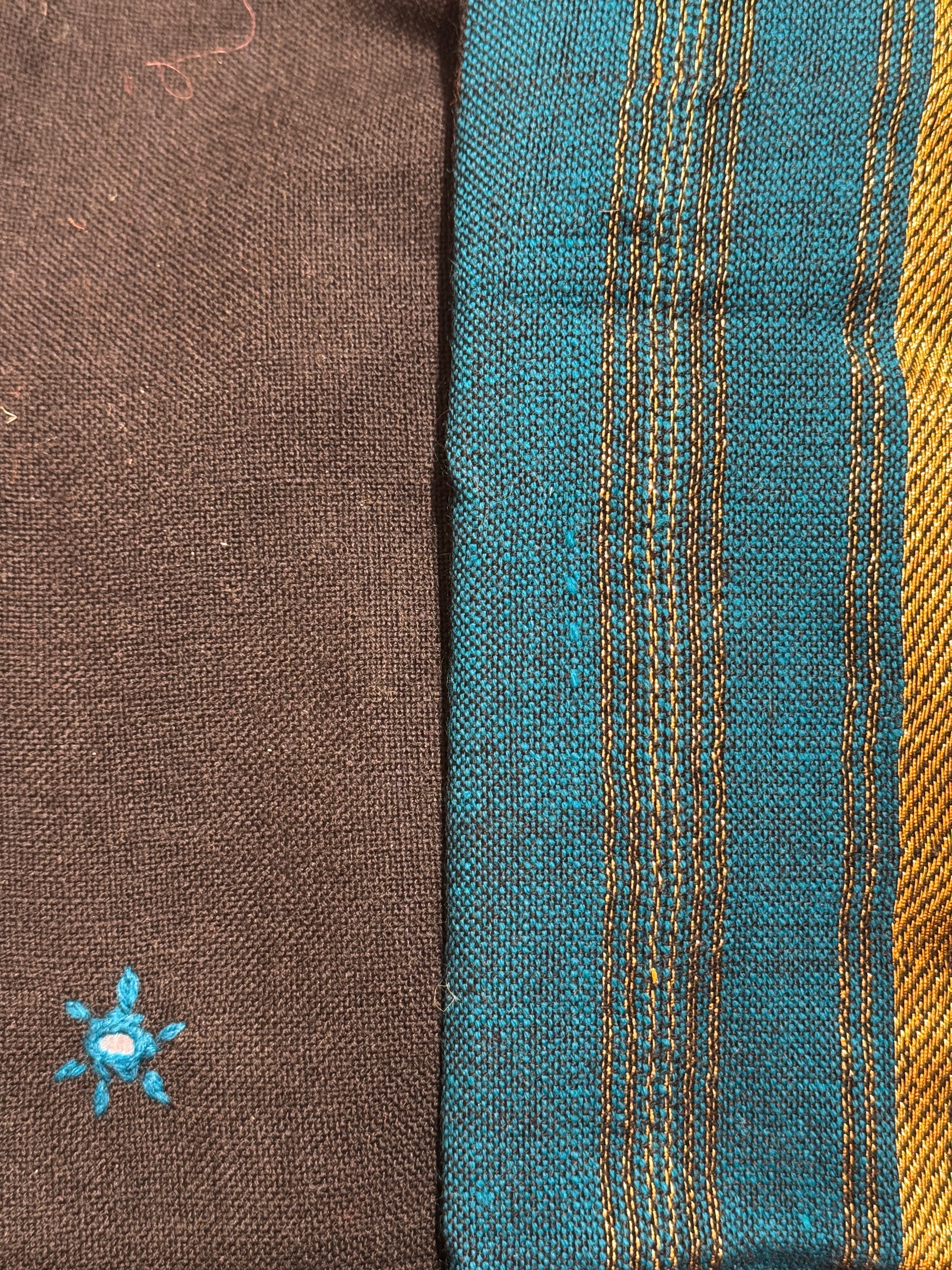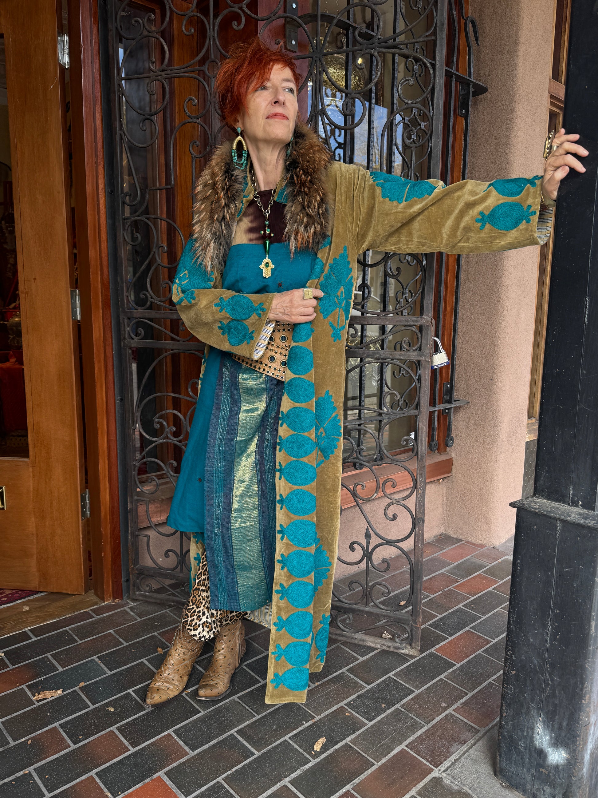 Who doesn’t want to be wrapped up in yummy softness and warmth this cool winter season? That’s exactly what this woolly wrap skirt does— all that and in great style and ease. This wrap skirt is made of hand loomed soft Indian "cotton-wool" which is actually a non itchy synthetic fiber blend. It is soft to the touch. The skirt is enhanced by hand-embroidered mirror work and a striking swath of metallic weave on the vertical. Choose your color story below with sizes Small/Medium and Medium/Large. Norma is wearing a Med/ Large in photos.